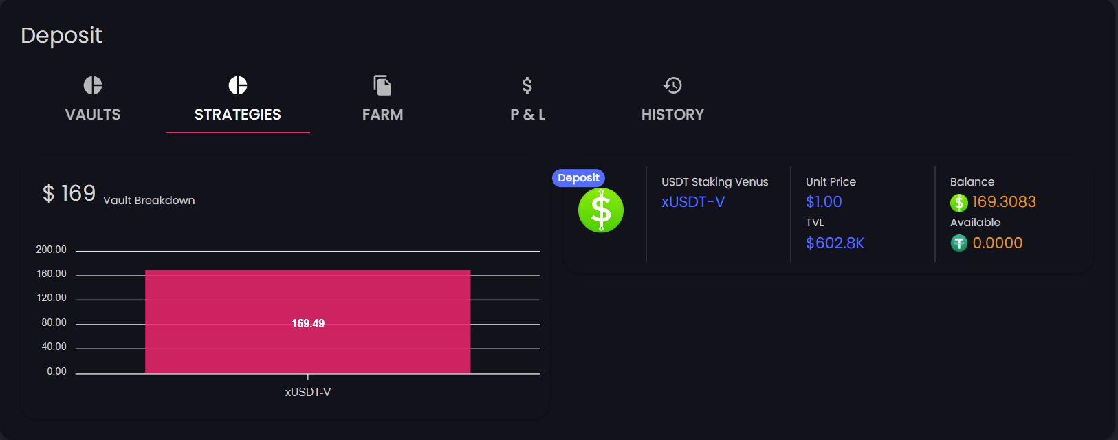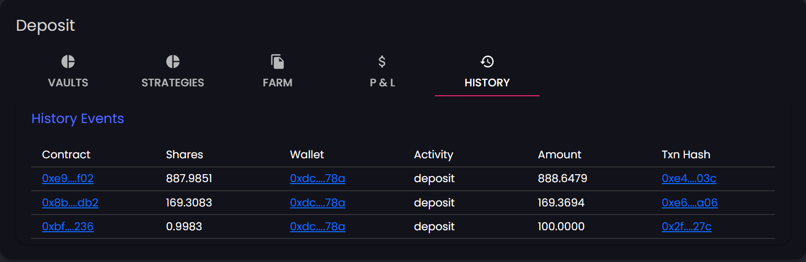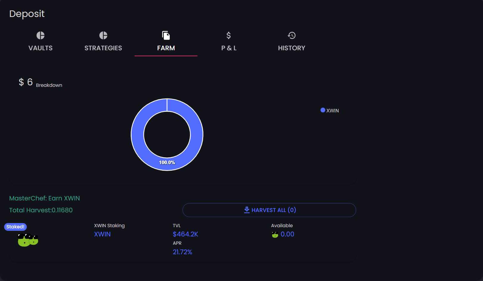 There are five tabs on this Deposit page (Vaults, Strategies, Farm, P\&L, History), each of which gives you an overview of how you are using xWIN Finance via your wallet.