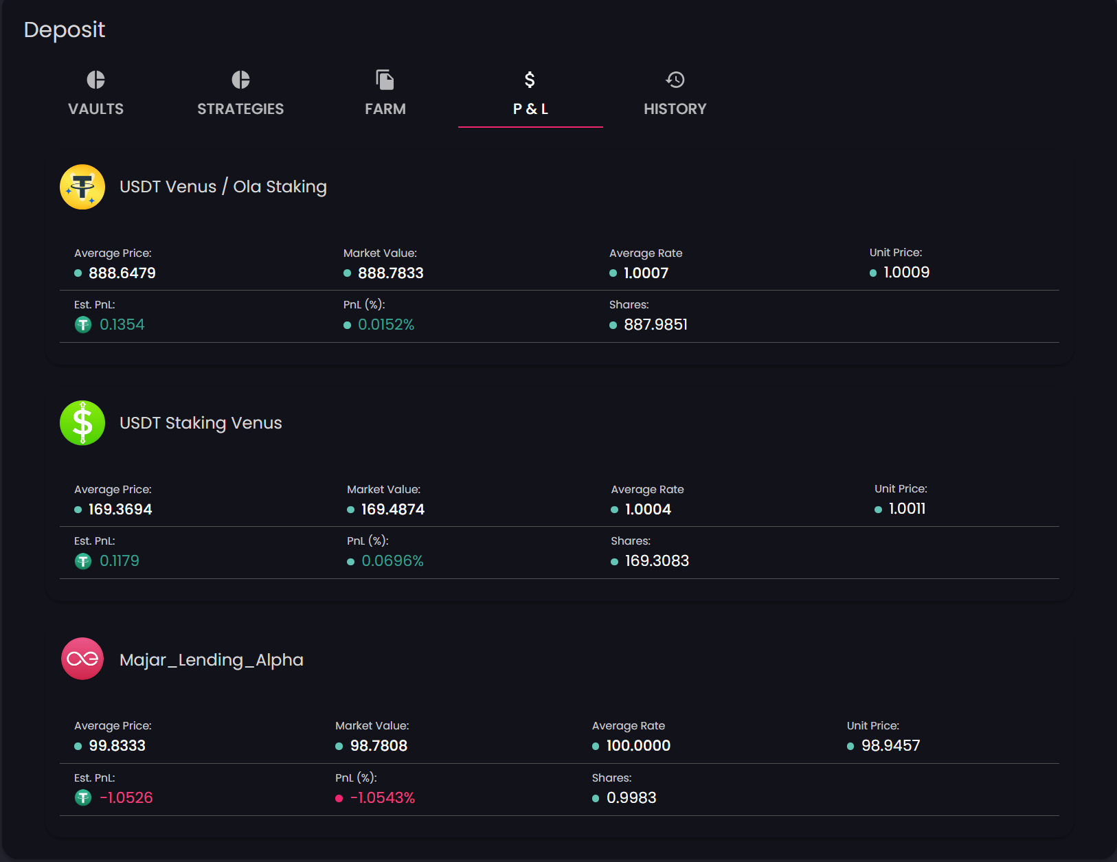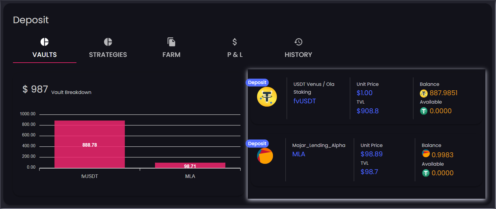 The amount of money deposited in the Single Strategy is shown in a graph in Vault Breakdown, which is very easy to understand. Clicking on each vault will take you to a page with more detailed information.&#x20;